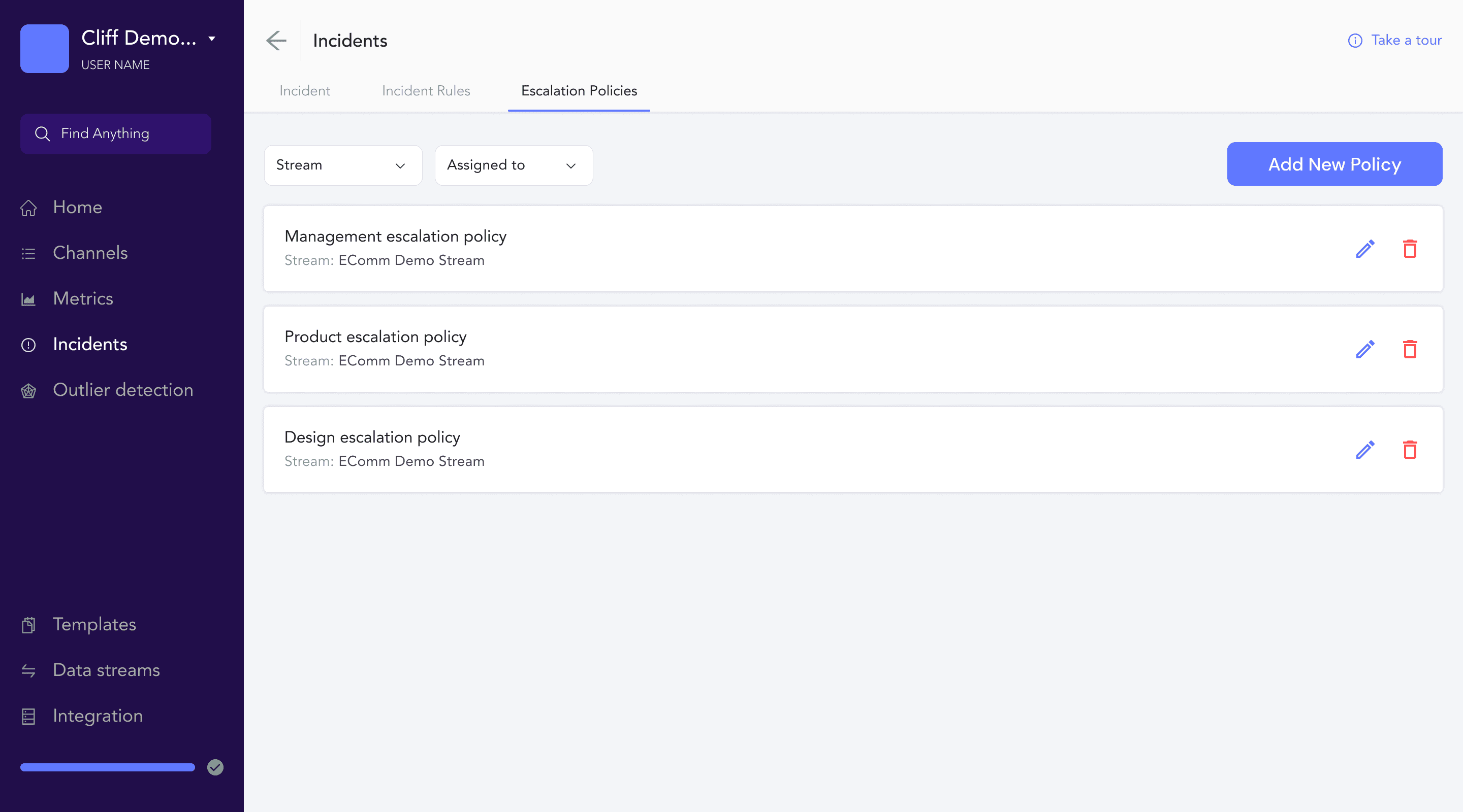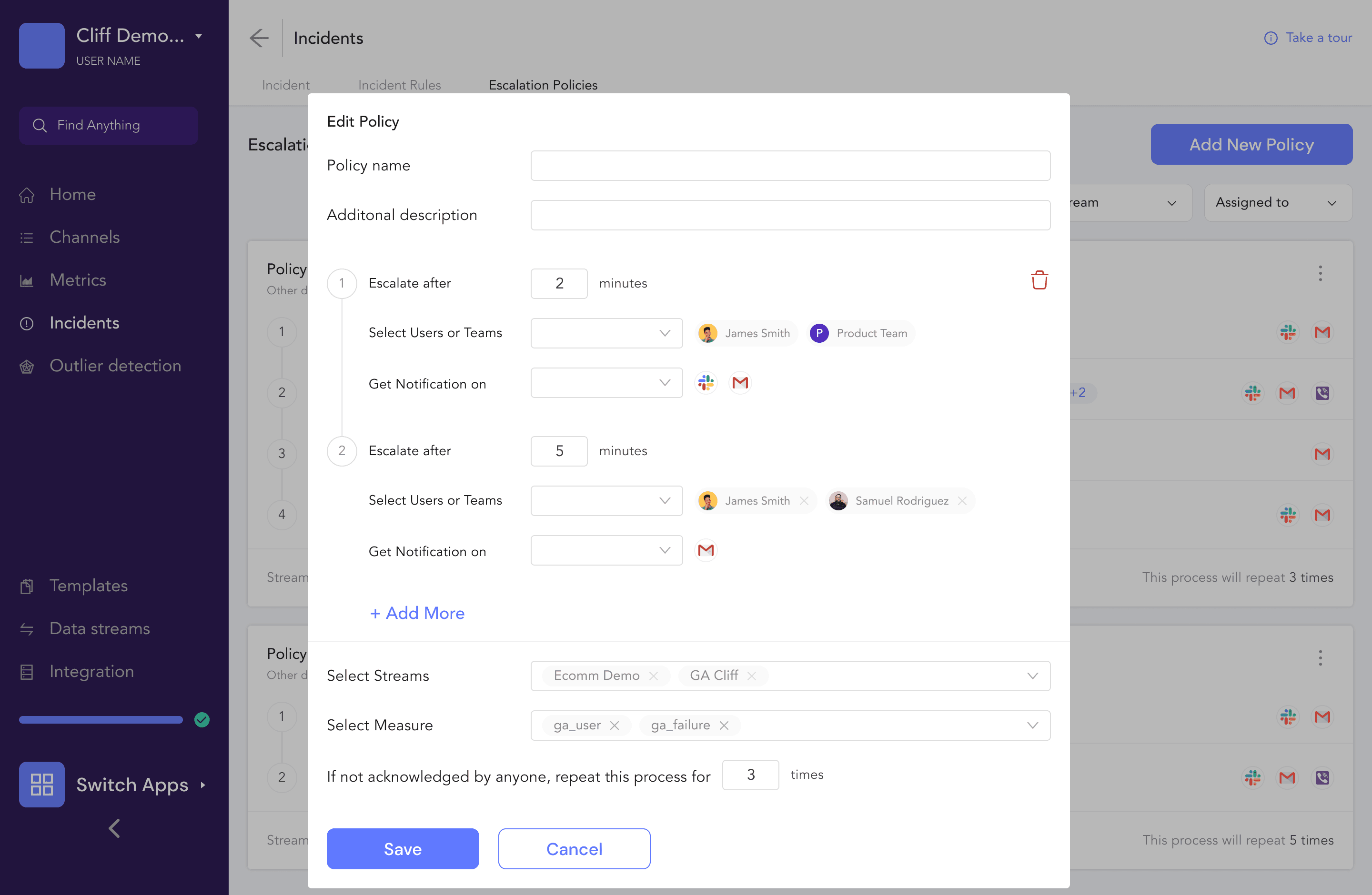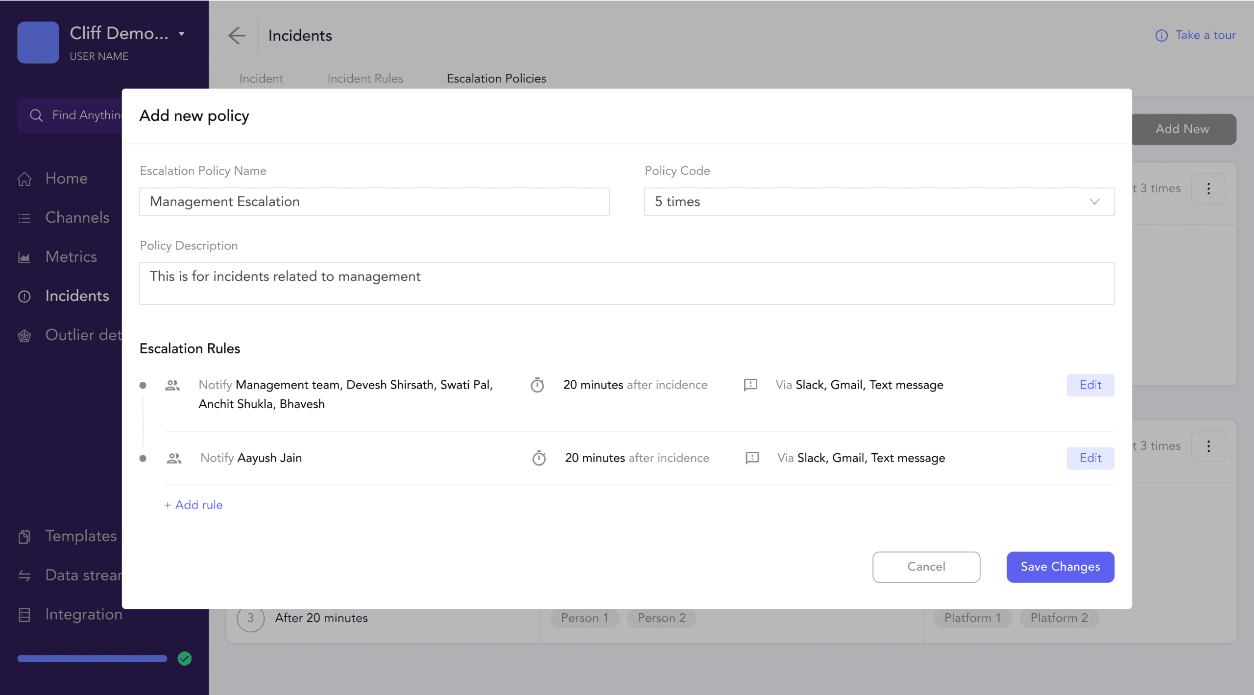 Cliff.ai lacked prompt anomaly notifications, so we introduced an escalation policy for users to select recipients and specify details.
