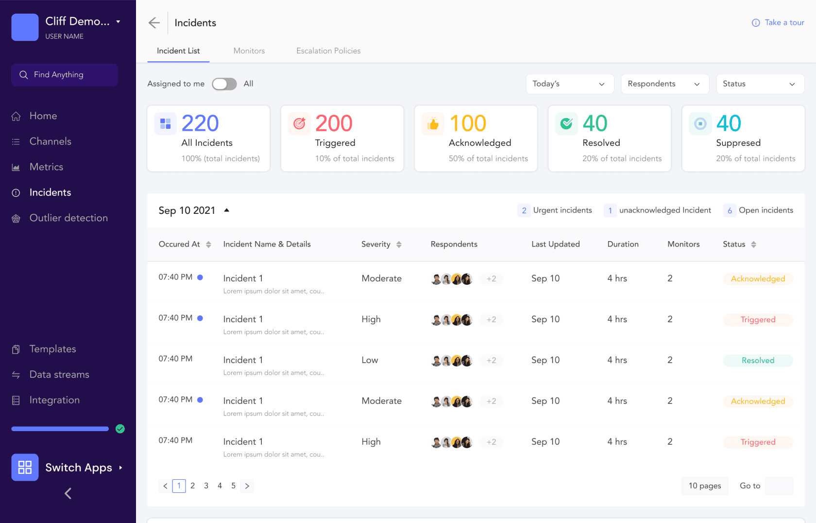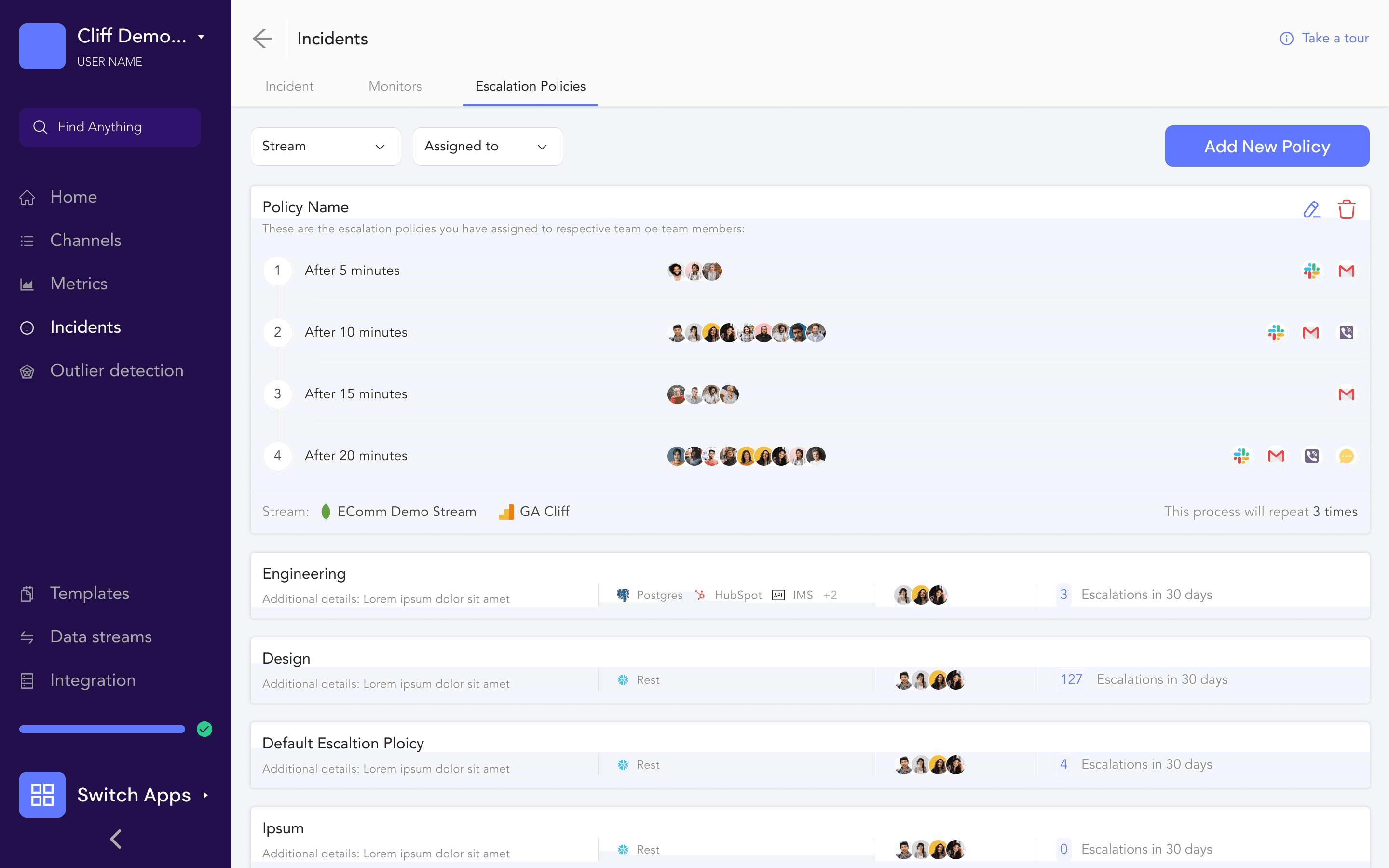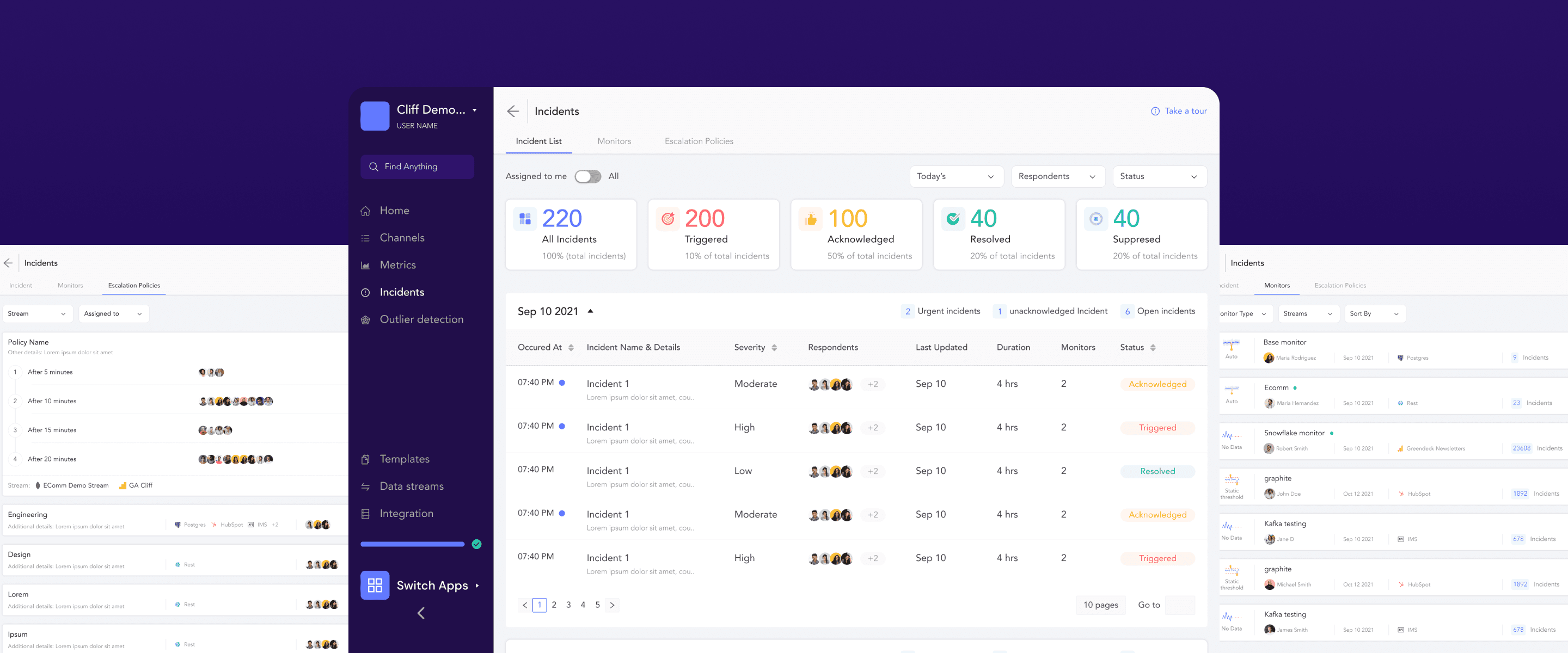 Based on the user-testing feedback, we started working on the screens. Let’s go deeper and view incidents, monitors and escalation policies in detail.